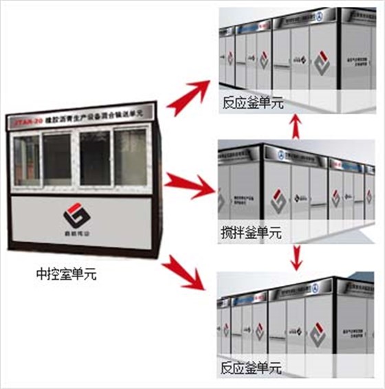 JTAR系列橡膠瀝青生產(chǎn)設(shè)備采用集裝箱式模塊化設(shè)計(jì),標(biāo)準(zhǔn)配置為四個(gè)單元:
